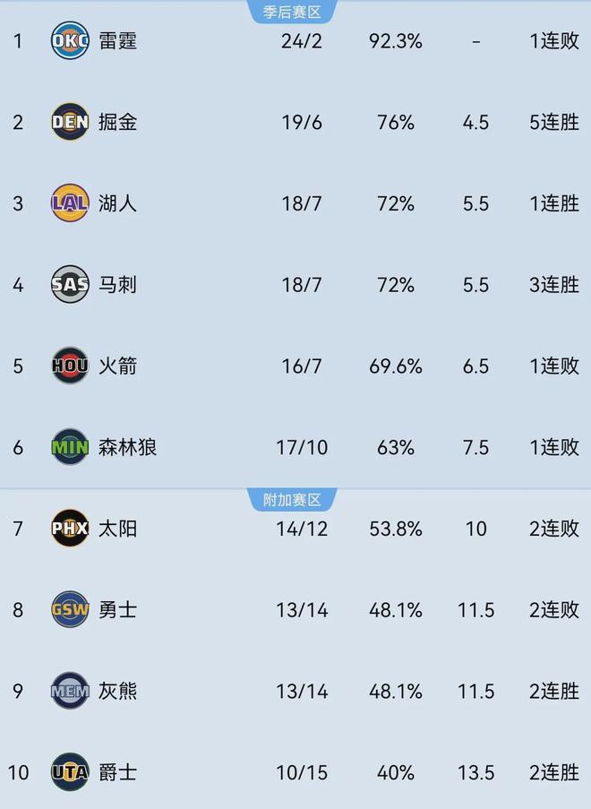 目前湖人以18胜7负战绩高居西部第三,落后第二的掘金1个胜场,同时战绩与第四的马刺打平,仅领先第五的火箭1个胜场,随时有着掉出前三甲的风险。